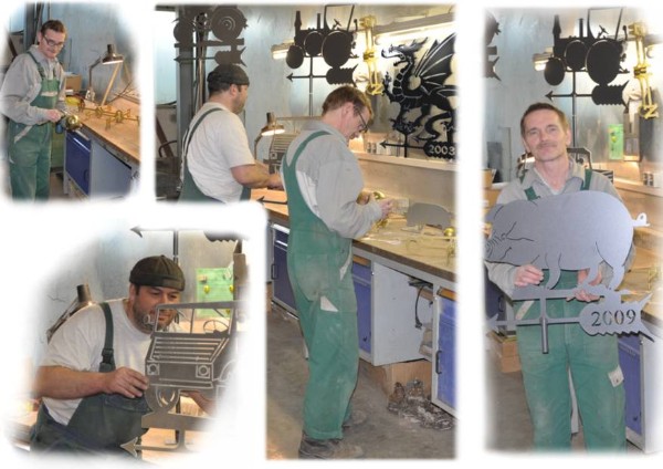 Wir haben vor über 10 Jahren mit der Herstellung von Wetterfahnen begonnen. Alles hat angefangen mit einem Wetterhahn aus Blech den wir über ein Internetportal gekauft hatten. Nach nur ein paar Jahren ging die Fahne nicht mehr und sie war schon sehr verrostet. Der Stab der seitlich am Motiv befestigt war hat auch nicht mehr gehalten.